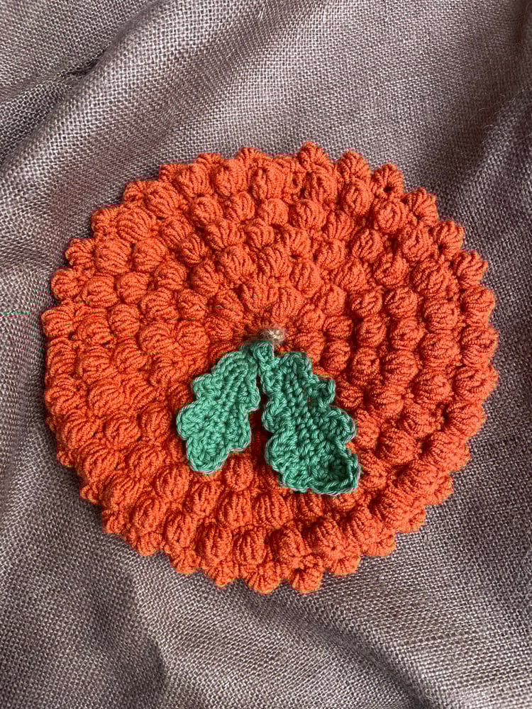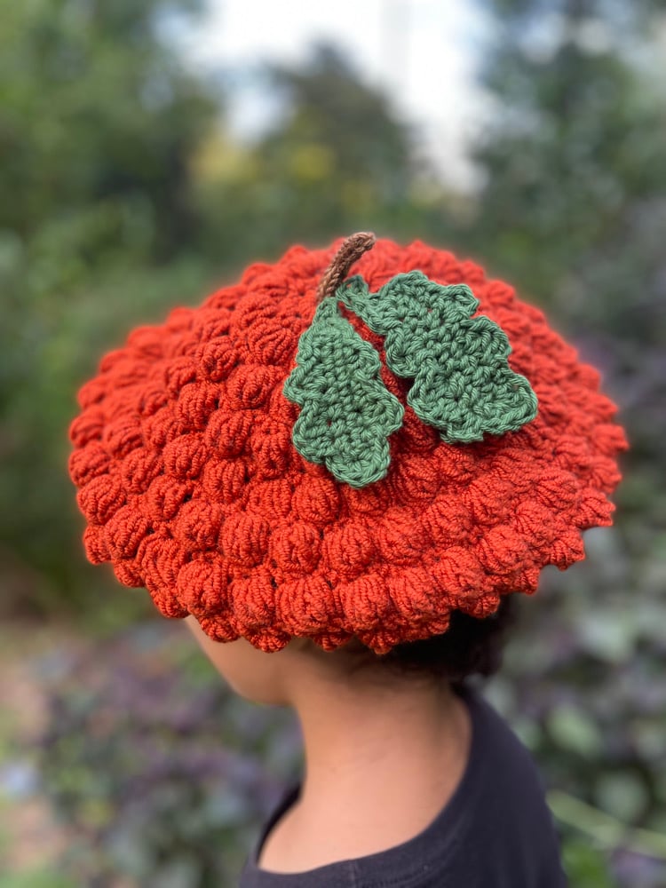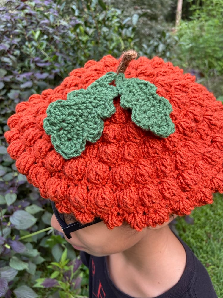 This handcrafted crochet acorn hat is complete with oak leaves, but the orange color makes it look very pumpkin-y. It’s a fun hat either way!